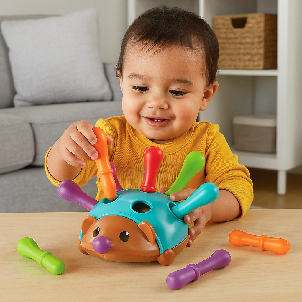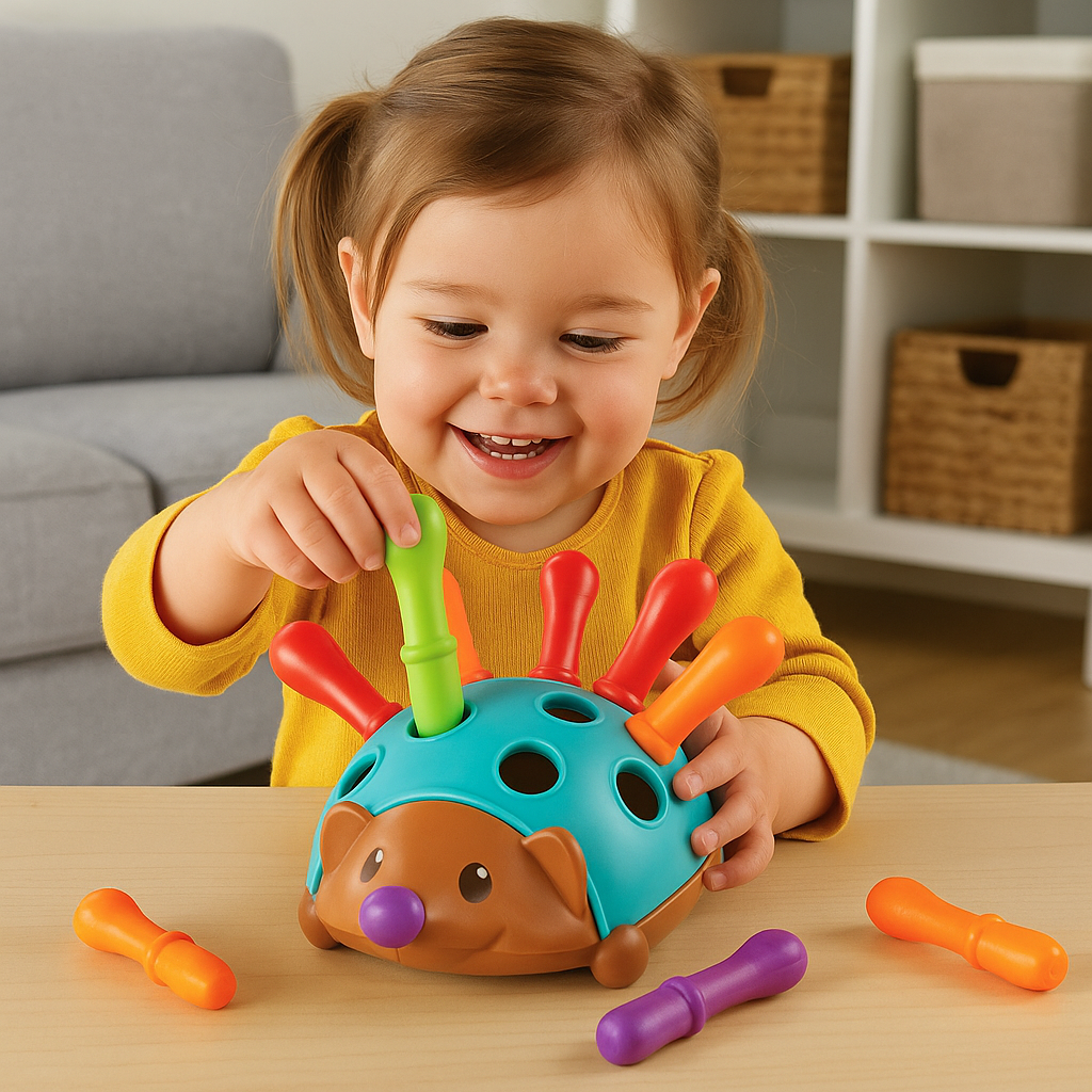 Zabawka w postaci kolorowego jeżyka została stworzona z myślą o naturalnym rozwoju dziecka poprzez zabawę. Polega ona na tym, że dziecko wkłada i wyjmuje kolorowe kolce umieszczone na grzbiecie, co sprzyja ćwiczeniu zdolności manualnych oraz koordynacji ręka-oko. Dzięki intensywnym barwom oraz przyjaznej formie, dziecko uczy się rozpoznawać kolory, a sympatyczny wygląd zachęca do interakcji i kreatywnej zabawy.