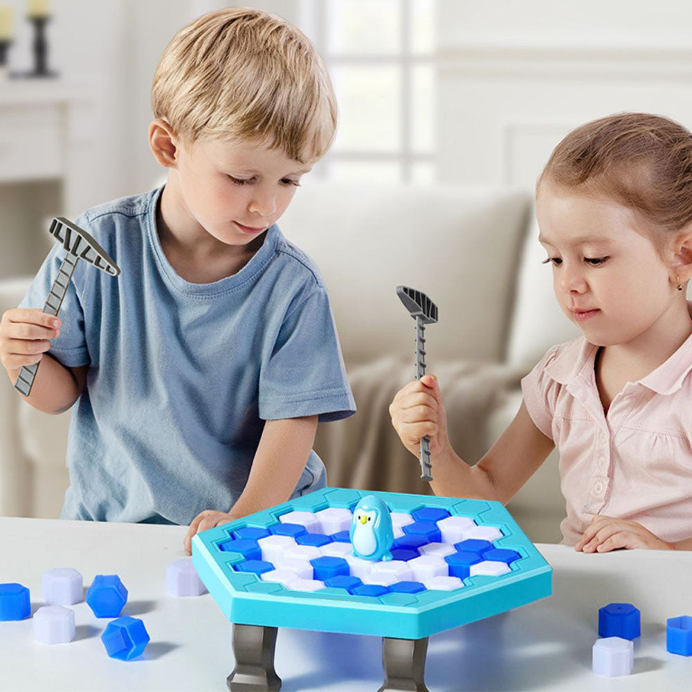 W zestawie znajdziesz kolorową planszę z kostkami lodu, młoteczki, obracane koło losujące oraz uroczego pingwina. Gra rozwija precyzję, refleks i umiejętność podejmowania decyzji. Idealna na wspólne wieczory i rodzinne rozgrywki.