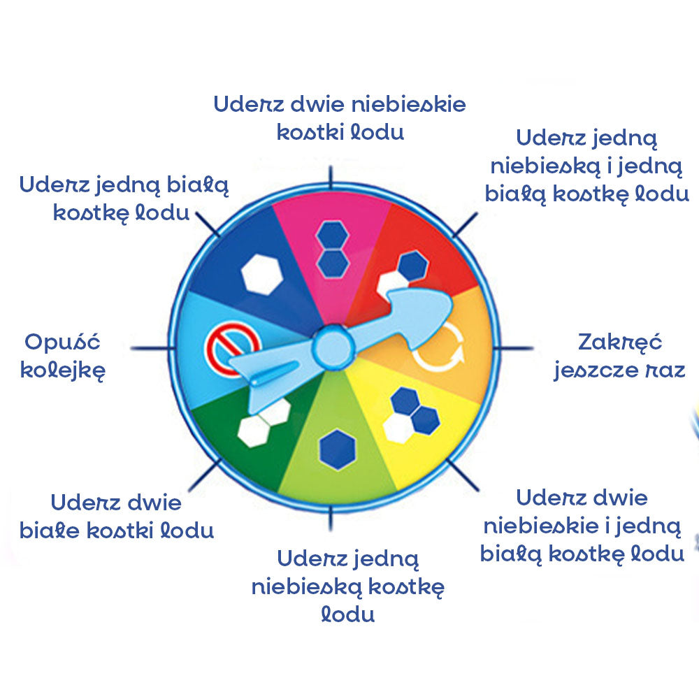 Gra „Pingwin na Lodzie” to nie tylko zręczność, ale też odrobina szczęścia! Zakręć kolorowym kołem losującym i sprawdź, co musisz zrobić – uderzyć jedną, dwie lub trzy kostki lodu, pominąć kolejkę albo zakręcić jeszcze raz.