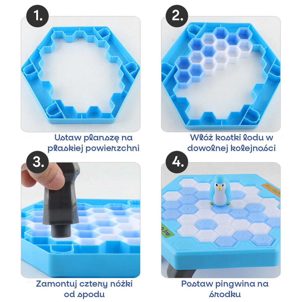 Zestaw zawiera komplet elementów gotowych do natychmiastowej gry. W środku znajdziesz ramę planszy, 38 kolorowych kostek lodu (po 19 niebieskich i białych), uroczego pingwina, tarczę losującą, 4 stabilne nóżki oraz 2 młotki do rozbijania lodu.