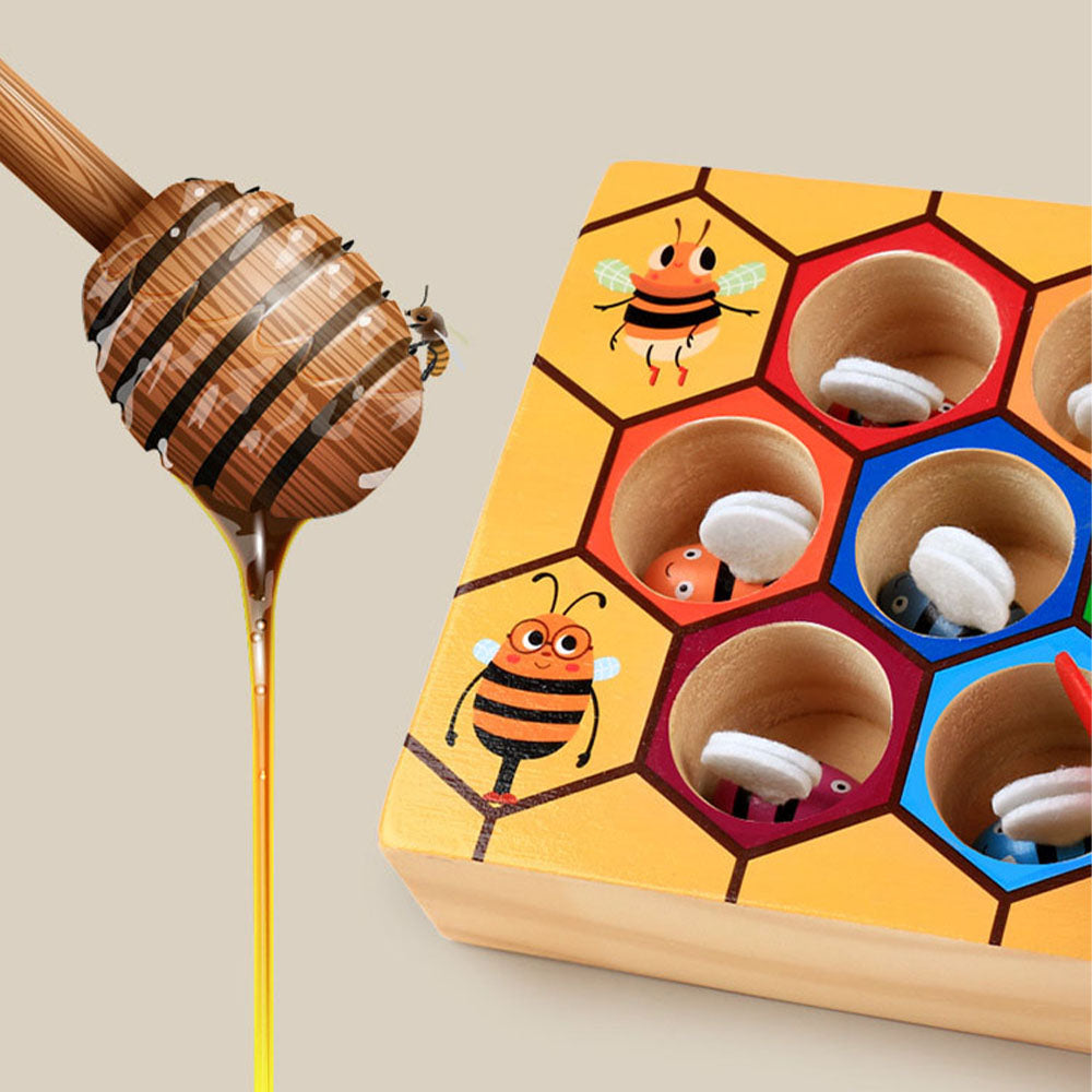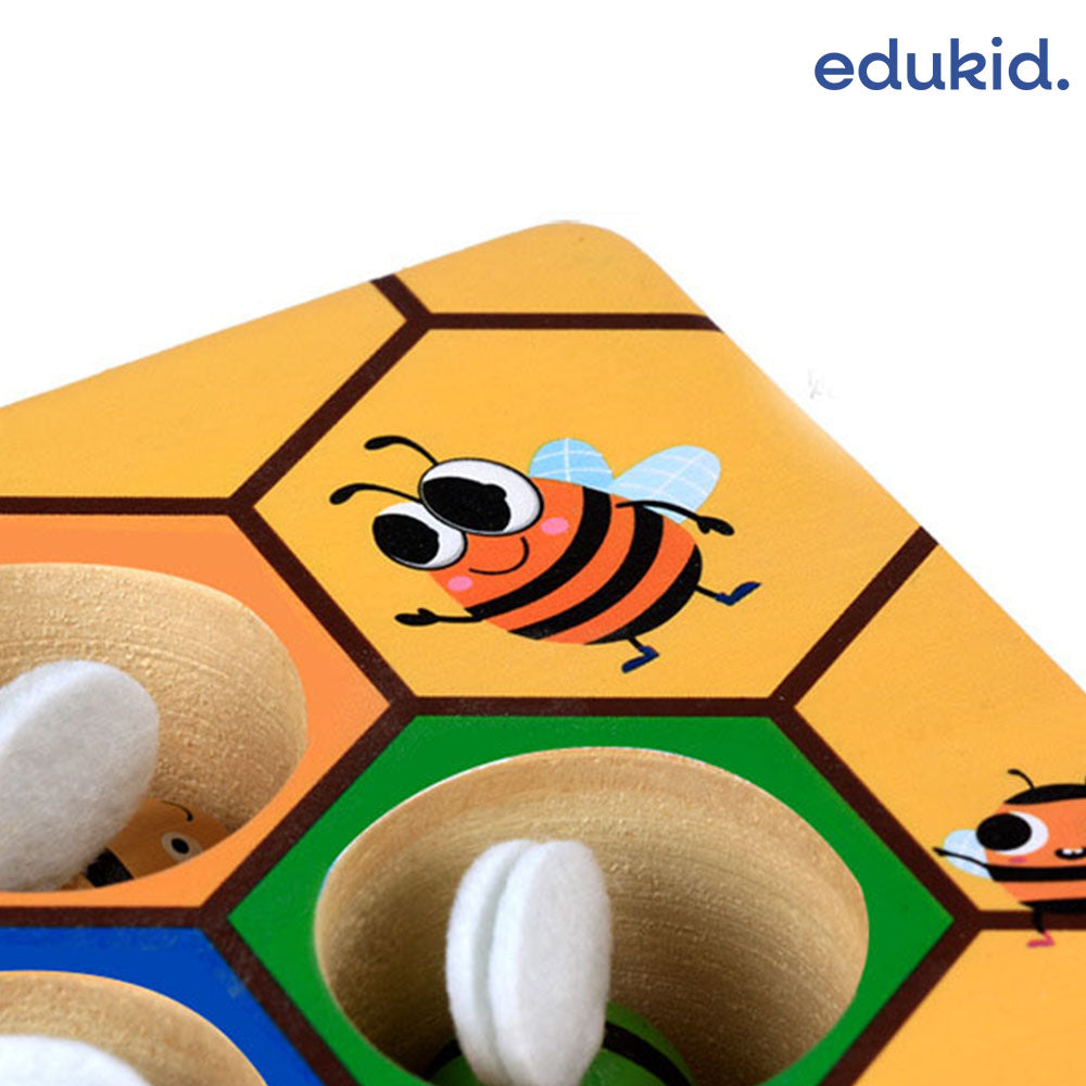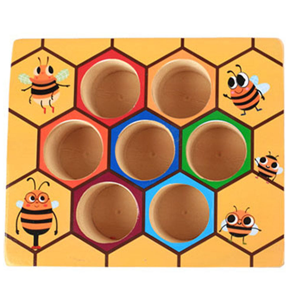 Zadaniem dziecka jest dopasowanie każdej pszczółki do komórki o tym samym kolorze. Taka zabawa rozwija zdolności manualne, koordynację ręka–oko oraz uczy rozpoznawania kolorów.