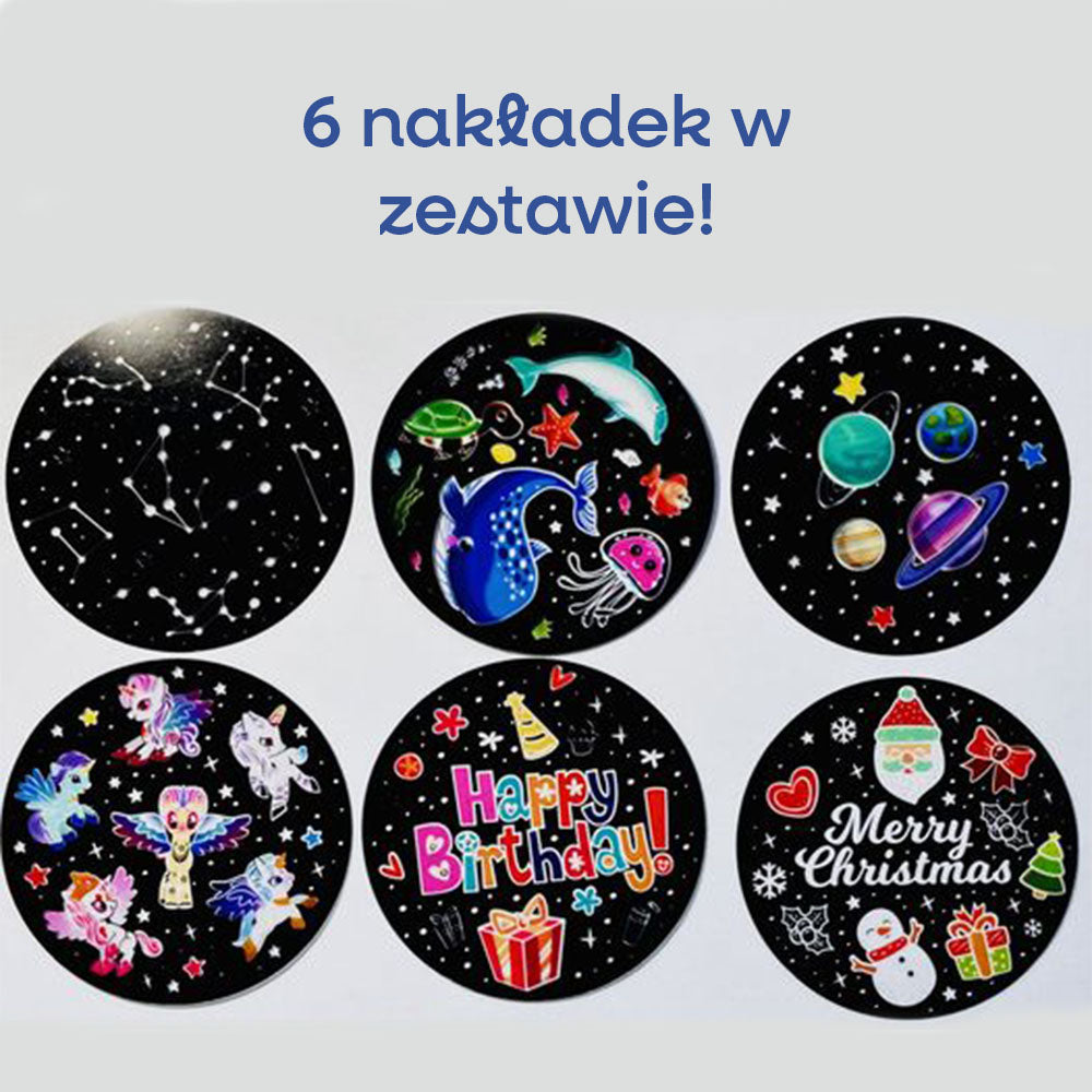 Ten projektor to nie tylko lampka nocna, ale prawdziwy wehikuł wyobraźni – a wszystko za sprawą aż sześciu wymiennych nakładek tematycznych, które pozwalają dostosować światło i klimat do nastroju, okazji lub pory roku.
