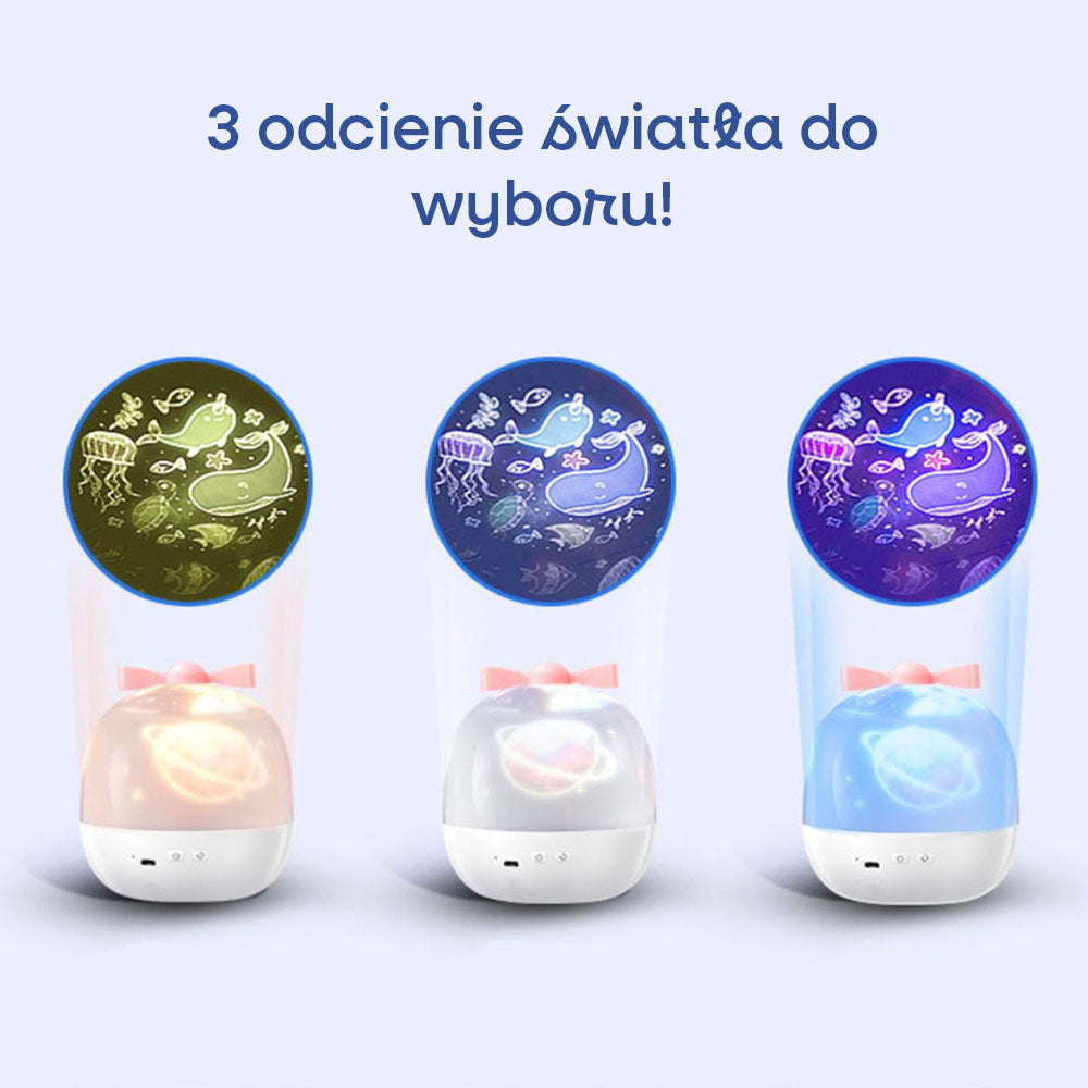 Projektor doskonale sprawdza się również jako lampka nocna, emitując ciepłe, delikatne światło, które tworzy przytulną atmosferę i pomaga się wyciszyć przed snem. Wprowadza spokój, relaks i poczucie bezpieczeństwa. To doskonały wybór dla tych, którzy nie lubią zasypiać w całkowitej ciemności.