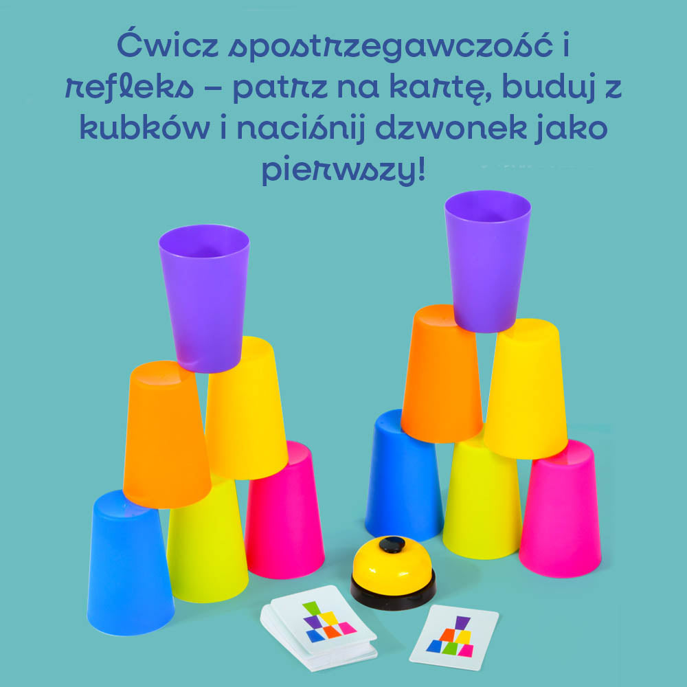 W zestawie znajdziesz aż 50 różnorodnych kart ze wzorami, które sprawią, że żadna rozgrywka nie będzie taka sama. Każda karta to nowe wyzwanie – układ kolorowych kubeczków, który trzeba odtworzyć jak najszybciej, zanim zrobi to ktoś inny!