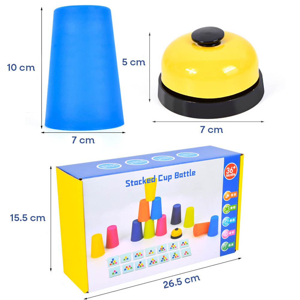 Kubeczki mają wysokość 10 cm i średnicę 7 cm – są lekkie, kolorowe i doskonale dopasowane do dziecięcych dłoni. Dzwonek o średnicy 7 cm i wysokości 5 cm jest łatwy do naciśnięcia nawet dla najmłodszych uczestników zabawy. Całość zapakowana jest w poręczne pudełko o wymiarach 26,5 × 15,5 cm – idealne do przechowywania lub zabrania w podróż.