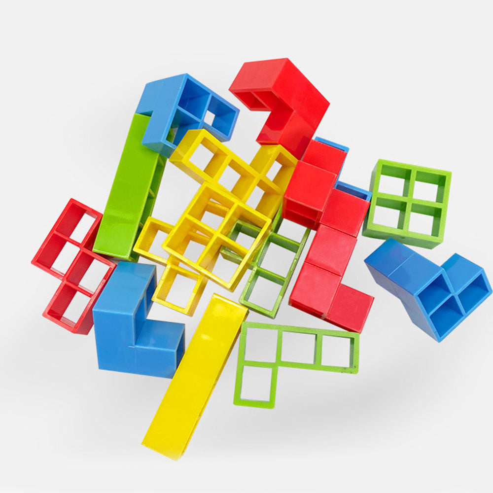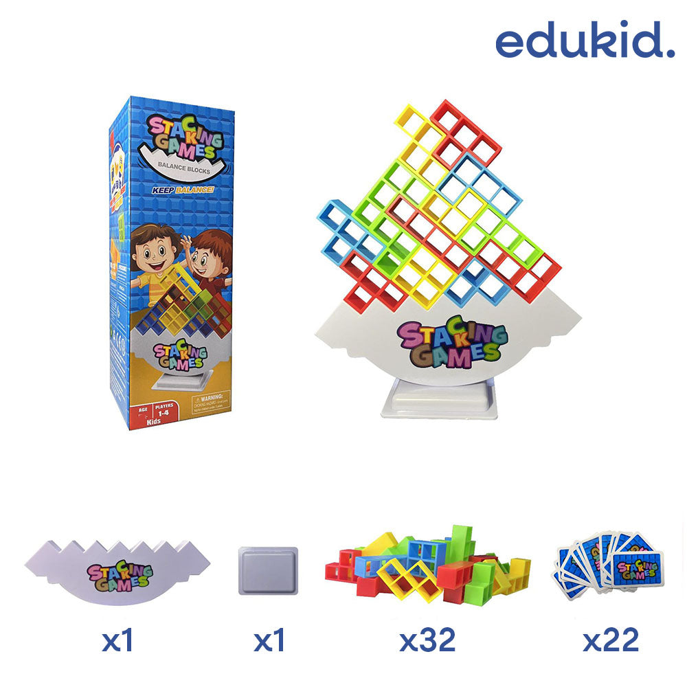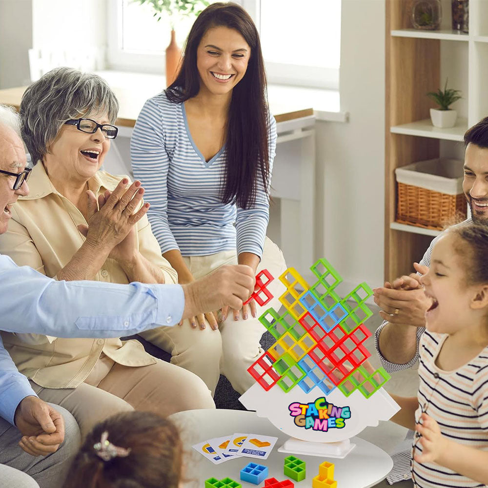 "StackingGame" to wciągająca gra polegająca na układaniu kolorowych klocków na balansującej podstawce. W zestawie znajdują się specjalne karty z układami klocków – gracze losują kartę i muszą dokładnie odwzorować kształt na chwiejnym podeście.