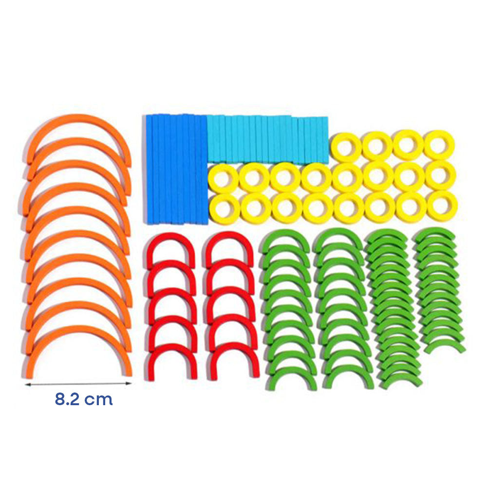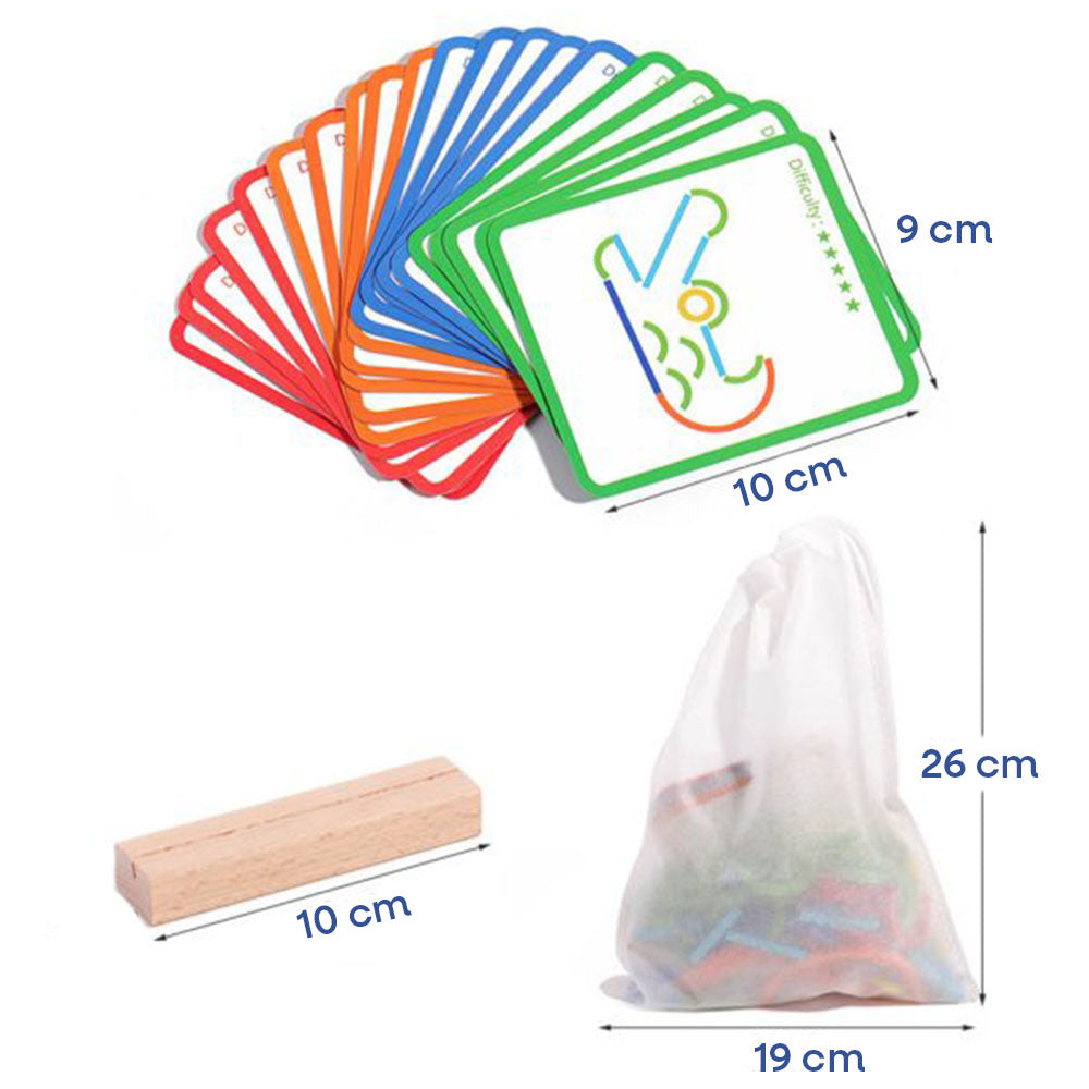 Zestaw składa się ze 140 elementów, które wspierają kreatywność i rozwój dziecka. W środku znajduje się 20 dwustronnych kart o wymiarach 10 × 9 cm z różnorodnymi wzorami do odwzorowywania – od liter, przez pojazdy, aż po przedmioty i zwierzątka. Do układania służy 120 kolorowych elementów w różnych kształtach i rozmiarach, w tym patyczki, kółka oraz łuki w trzech wielkościach, wykonanych z drewna, pomalowanych bezpiecznymi dla dzieci farbami. Wszystkie części są gładkie, starannie oszlifowane i mają zaokrąglone krawędzie, dzięki czemu są całkowicie bezpieczne. Wszystko można wygodnie przechowywać w praktycznym materiałowym woreczku o wymiarach 26 × 19 cm, który dołączony jest do zestawu. Zabawka powyżej 3 roku życia.