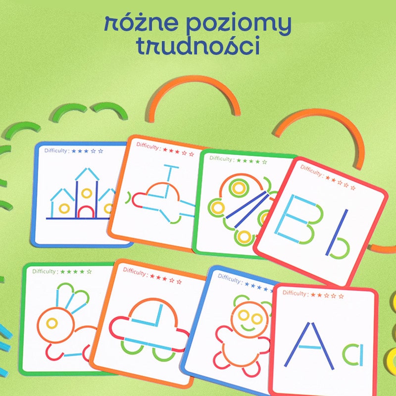 Zestaw wspiera wszechstronny rozwój dziecka. Zabawa z kolorowymi patyczkami i kółkami pomaga ćwiczyć motorykę małą, koordynację ręka–oko i logiczne myślenie. Układanie wzorów z kart rozwija koncentrację, uczy rozpoznawania kolorów, kształtów oraz pierwszych liter. To świetny sposób na naukę przez działanie – bez nudy i ekranów. Dziecko tworzy, eksperymentuje i uczy się poprzez zabawę, która dostosowuje się do jego tempa i umiejętności.